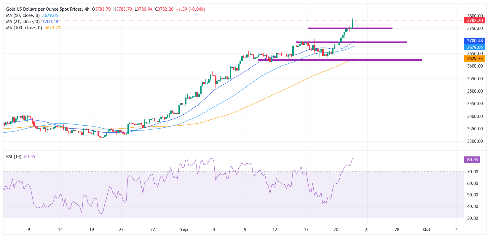 Despite daily and hourly Relative Strength Index (RSI) readings flashing deep into overbought territory, buyers remain firmly in control. Unless Gold slips back below $3,700, the path of least resistance stays higher, leaving room for further all-time highs in the near term.