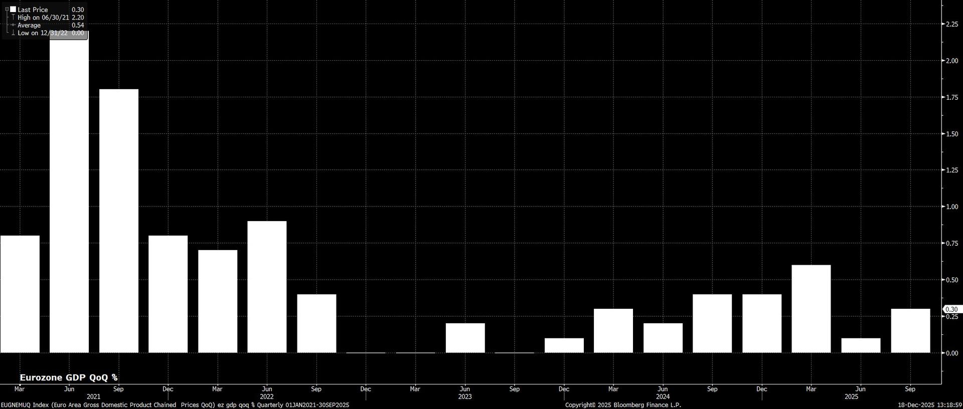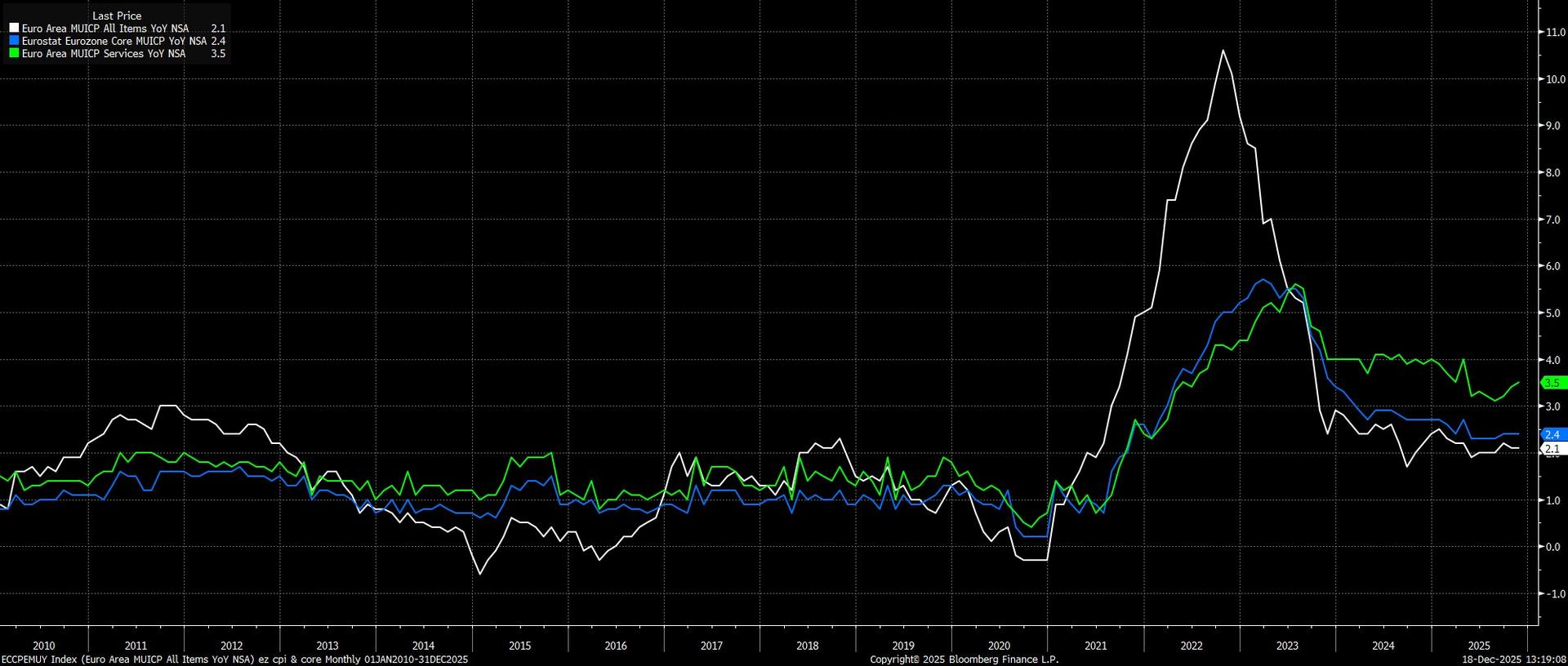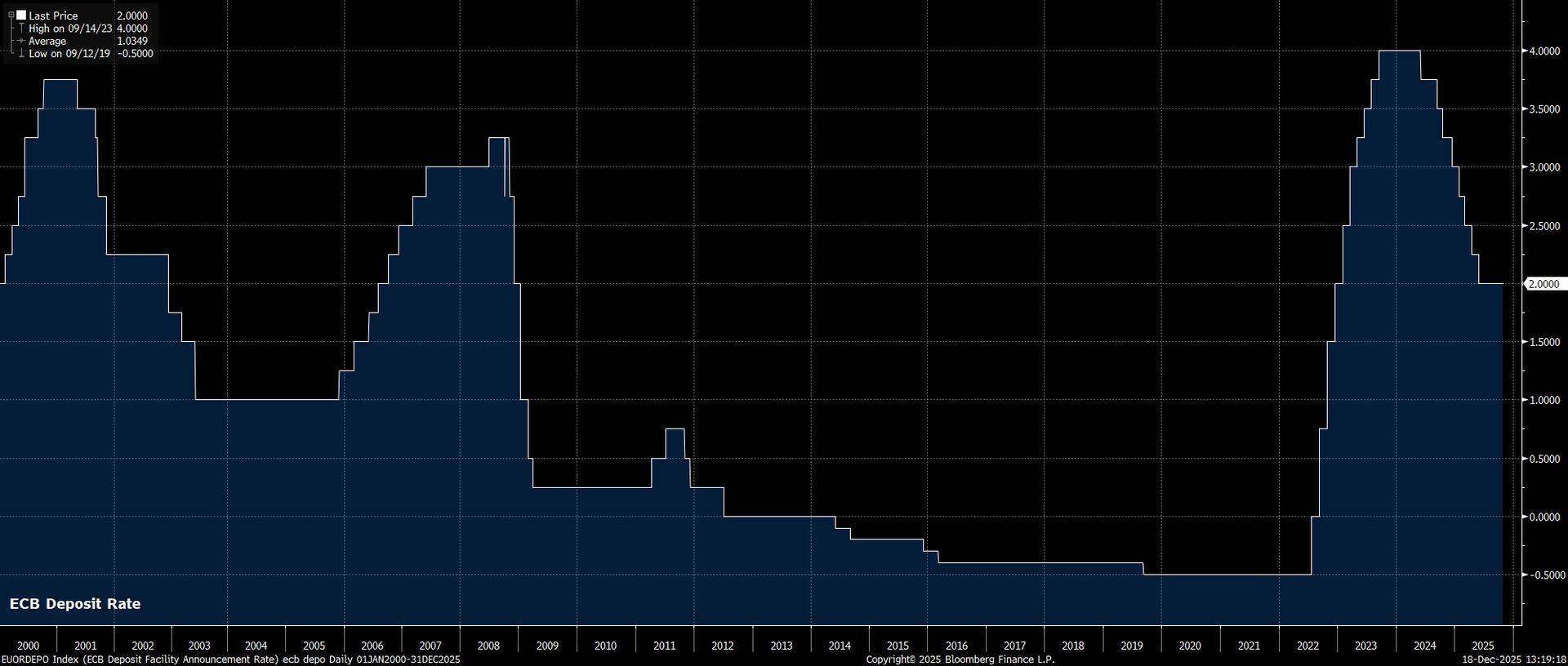 Very much in line with expectations, the Governing Council did nothing to materially alter the policy outlook at the final meeting of 2025, with the deposit rate having been reduced by 200bp from last year’s peak, and now sitting well within the ECB’s range of estimates as to where the eurozone’s neutral rate lies.