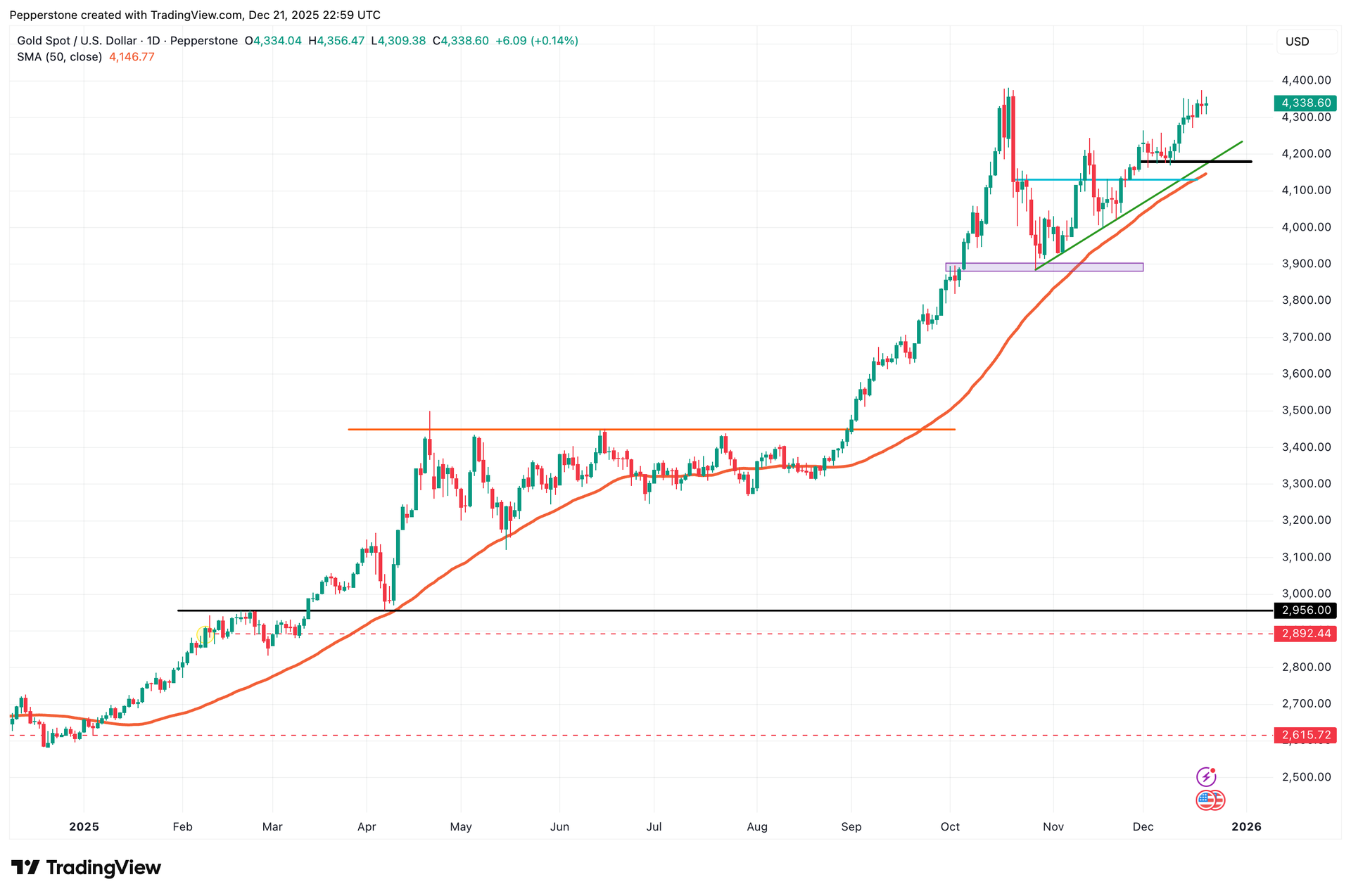 As the year draws to a close, traders are asking two key questions: can the bullish momentum of 2025 extend into 2026? And what forces may continue to support gold—or cap its upside—from here?