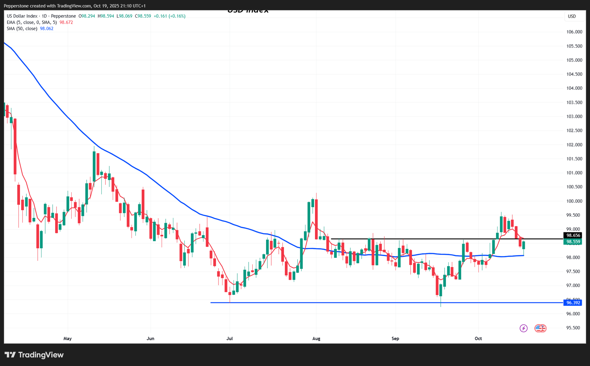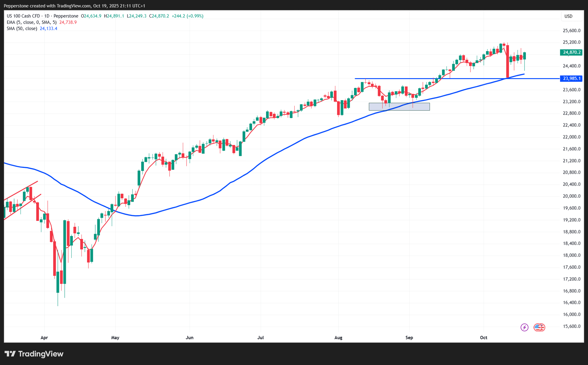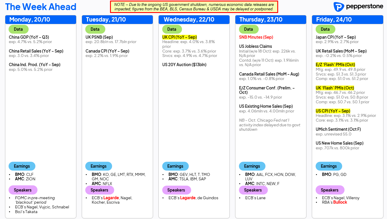 Traders remain highly attuned to risk and aware of the potential for elevated volatility around U.S. earnings reports. However, as we enter the new week, there’s a prevailing belief that U.S.–China trade headlines will remain skewed toward a positive outcome. Following last week’s dovish speech from Jay Powell, and with the Federal Reserve now in its blackout period, expectations are high that the Fed will cut rates at both the October and December FOMC meetings.